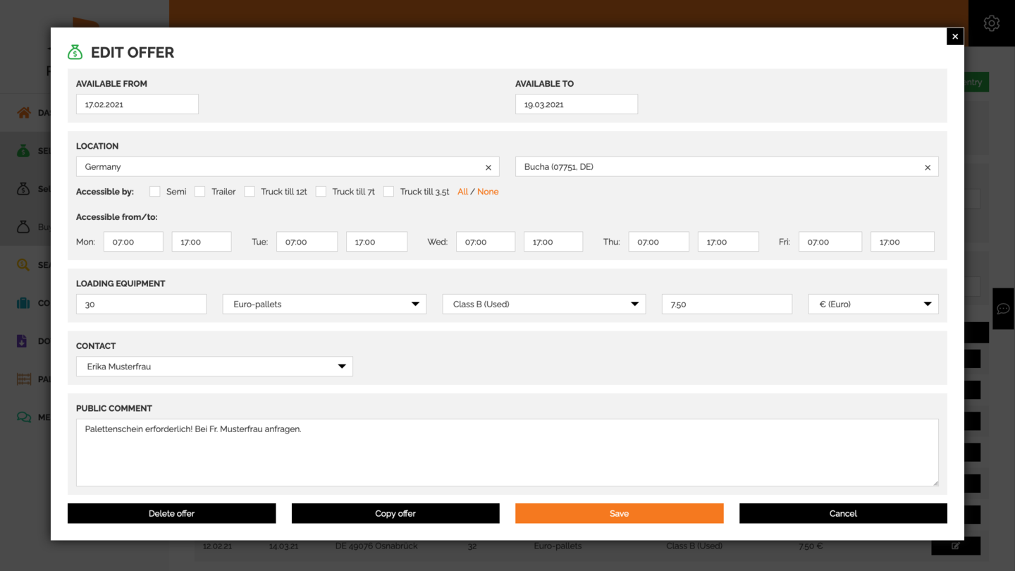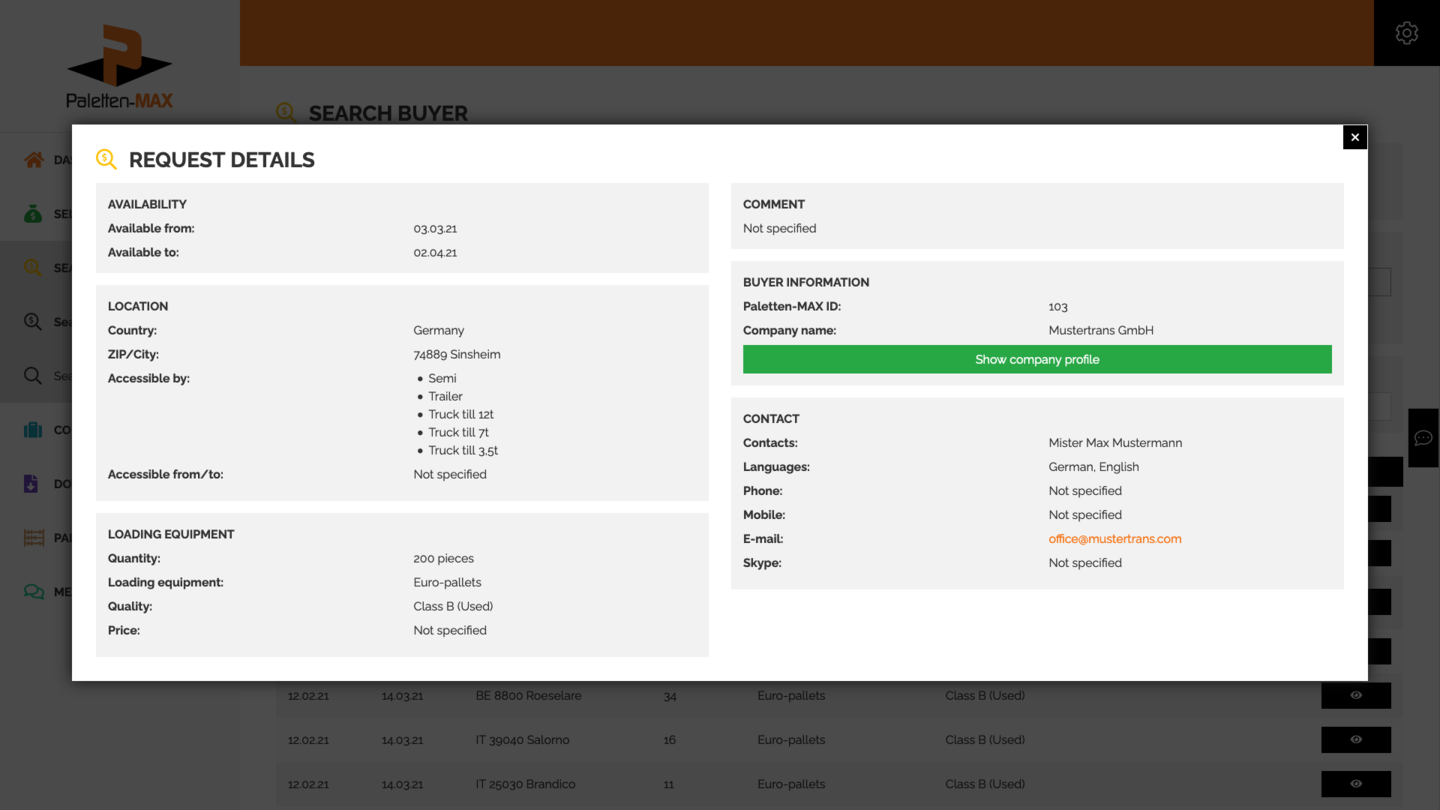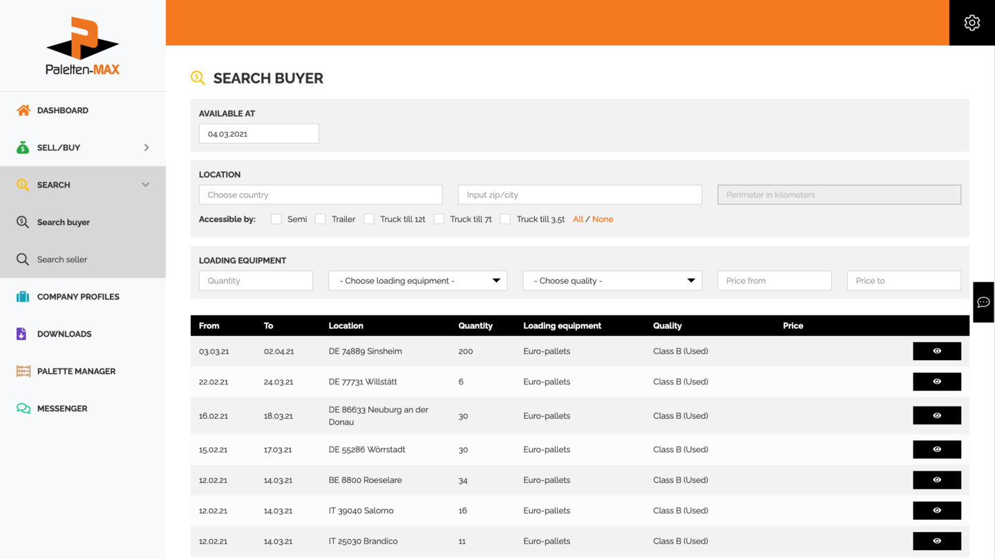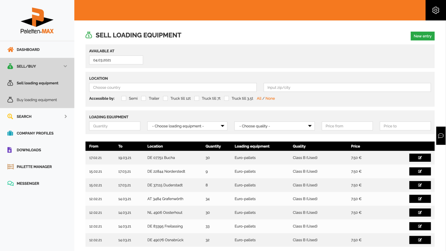 Vi offriamo una borsa neutrale e indipendente per la vendita e l`acquisto di pallets e unita´di carico. Se non volete rendere pubblica la Vostra offerta, potete anche selezionare i venditori/compratori a cui presentare la Vostra offerta.